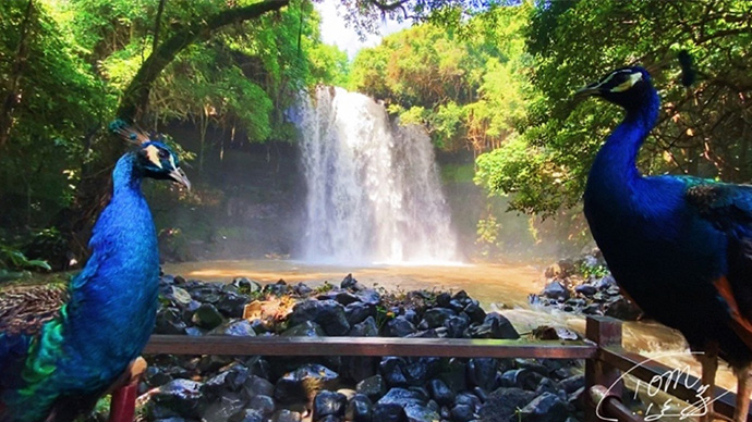 从海口驱车约莫50分钟可到皇桐镇,穿过居仁村村门,在乡道上拐几个弯,下车便能听见远处先声夺人般地奏响着流水的音符,潺潺而湍湍,令人忍不住快走几步,只为一睹倾泻而下的壮观。踏上木质栈道,伴随着两侧的青翠和盎然,俨如朝圣的玄关,亭亭如盖的树冠遮蔽艳阳,千姿百态的枝干残绕其间,抬眼可见野花绿果,低头可见淙淙流溪,朱红石刻引诗颂赞,林中百鸟争鸣悠扬。转过一个弧形栈道,水声更加激昂,远远可见一帘白色水幕倾泻而下,高处激流涌动,前仆后继地投入圆形的清潭,激起无数欢快的白浪,浪花过处,如烟如雾,随风而散,轻抚着每个游客的面庞,沁人清凉。