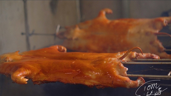 受过古银瀑布的洗礼, 饱尽眼福之后,当然需要品尝一下临高当地美食,一饱口福。临高的美味众多,海味十足的牛眼螺和蛤蜊煎,爽滑软细的临高粉,鲜嫩质脆的空心菜,还有独具风味的韭菜饼……但最为令人叫绝还要数临高烤乳猪,从古银瀑布驱车20公里到临高县城的新桥南路,这里聚集着临高各具风味的餐饮店,当然,烤乳猪店也必不可少。临高烤乳猪选十二三斤的乳猪,剖腹碎骨,上料腌制,洗净后用文火旋转烘烤,经过四五个小时的烘烤,乳猪烤至全身焦黄,油光可鉴,便可端上餐桌。临高乳猪讲究的是色香味俱全,色同琥珀,又类真金,入口酥脆,能清楚听到咀嚼的脆响,合嘴一品,又瞬间融化,一股浓郁的肉香直上鼻腔,若是佐之秘酱或白糖,又会增加另一道芳香。临高人对烤乳猪的喜爱,无与伦比,一盘烤乳猪,一段煮血肠,一碟小酸菜,一杯清米酒,这就是临高人一天的开始。