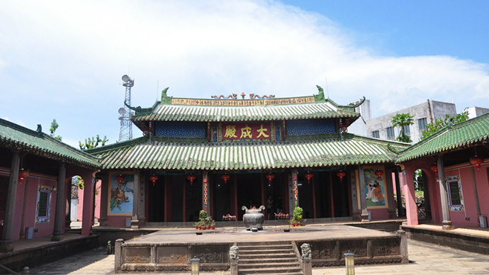 走进院子,踏上白色步道,一眼可见红墙绿瓦,古意典雅,穿过棂星门,走上状元桥,俯身泮池可观涟漪点点,鱼龟携游,10棵笔直椰子树分列院里两侧,亭亭而立,更显庄严。穿过大成门,便可见古朴的大殿,红门绿瓦,绿瓦正中悬挂着红底金字刻着“大成殿”的匾额,石门两侧分别彩画讲述着姜尚垂钓和三顾茅庐历史典故。循石狮扶手拾阶而上,硕大的铜制香鼎突显出了古刹气派,也反映出了临高人对儒学文化的崇尚。大成殿内,孔子的大型塑像端坐在殿里的正中央,庄重儒雅,千百年来受之临高人民对于文化敬仰和圣贤爱戴。