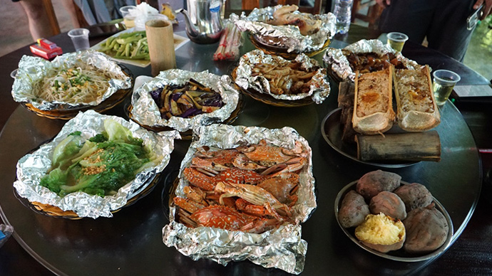 如果你还在为刚刚买下的新鲜海鲜的后续犯难,我建议你到镇上的吉海土窑鸡饭店寻找另一种烹饪方法,品尝独具特色的海鲜大餐。这种土窑烹饪方式是大多数农村孩子小时候的记忆,先堆好圆形土基,再将挖出的土块按大小层层排列而上,每搭一层都要往里面收一点,直至封顶,封顶后检查窑四周,将大洞用土块补好。土窑垒砌好后,在土窑中点燃柴火,将土块烧至红热,接着,用铁锹将烧好土块拍成沙状,铺一层热砂在底,再将锡箔纸裹好食物投进砂里,最后在上面覆上热砂掩埋,用热砂烹饪食物。这样做出来的食物,不仅能锁住食材的原滋原味和水分,也更加的清香。随着时间长短,热砂覆盖下的食材也逐渐变成了一道道美味佳肴。当然,如果要评出这里的头牌食物,当然要算土窑鸡了,土窑盐焗出来的鸡既没有了炭烤的焦味,也没有了白斩鸡的硬韧,留下的是鸡肉本身的香气和清甜,入口软嫩,细腻爽口,若配上土窑烘出来的竹筒饭,更是另一番风味。