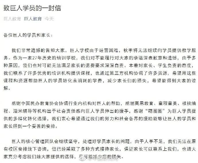31日,有27年历史的培训学校巨人教育发布公告称,由于经营困难,秋季将无法继续向学员提供教学服务。由于多种原因,巨人也可能无法满足家长的退费要求。巨人教育表示,高思教育、童程童美、核桃编程、溢米辅导等机构或将帮助巨人的学员转化未消耗的学费,减少家长们的损失。此外,巨人的核心管理团队会继续坚守,处理好学员家长的问题。