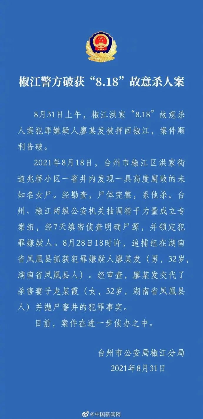 据椒江公安微信公众号消息,8月31日上午,椒江洪家“8.18”故意杀人案犯罪嫌疑人廖某发被押回椒江,案件顺利告破。2021年8月18日,台州市椒江区洪家街道兆桥小区一窨井内发现一具高度腐败的未知名女尸。经勘查,尸体完整,系他杀。台州、椒江两级公安机关抽调精干力量成立专案组,经7天缜密侦查明确尸源,并锁定犯罪嫌疑人。8月28日18时许,追捕组在湖南省凤凰县抓获犯罪嫌疑人廖某发(男,32岁湖南省凤凰县人)。经审查,廖某发交代了杀害妻子龙某霞(女,32岁,湖南省凤凰县人)并抛尸窨井的犯罪事实。目前,案件在进一步侦办之中。详情》》