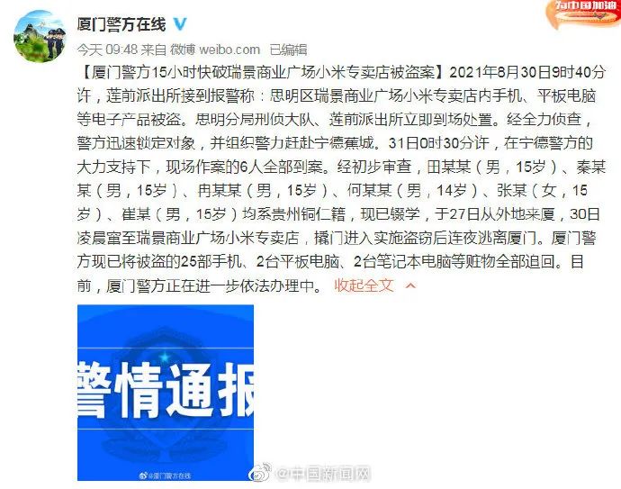 据@厦门警方在线 31日通报,8月30日9时40分许,莲前派出所接到报警称:思明区瑞景商业广场小米专卖店内手机、平板电脑等电子产品被盗。经侦查,警方迅速锁定对象,并组织警力赶赴宁德蕉城。31日0时30分许,现场作案的6人全部到案。经初步审查,田某某(男,15岁)、秦某某(男,15岁)、冉某某(男,15岁)、何某某(男,14岁)、张某(女,15岁)、崔某(男,15岁)均系贵州铜仁籍,现已辍学,于27日从外地来厦,30日凌晨窜至瑞景商业广场小米专卖店,撬门进入实施盗窃后连夜逃离厦门。厦门警方现已将被盗的25部手机、2台平板电脑、2台笔记本电脑等赃物全部追回。