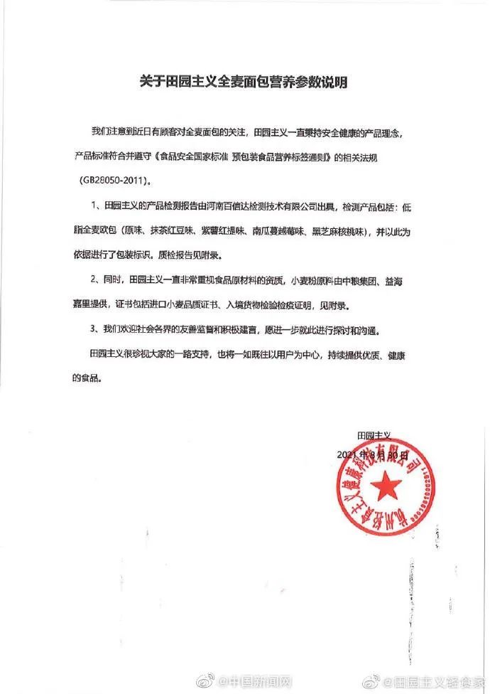 薇娅带货的低脂全麦欧包低标能量被上海市消保委质疑低脂全麦欧包低标能量后,30日晚,田园主义在官方微博回应称,田园主义产品标准符合并遵守《食品安全国家标准 预包装食品营养标签通则》的相关法规(GB28050-2011),产品检测报告由河南百信达检测技术有限公司出具,检测产品包括:低脂全麦欧包(原味、抹茶红豆味、紫薯红提味、南瓜蔓越莓味、黑芝麻核桃味),并以此为依据进行了包装标识。详情》》
