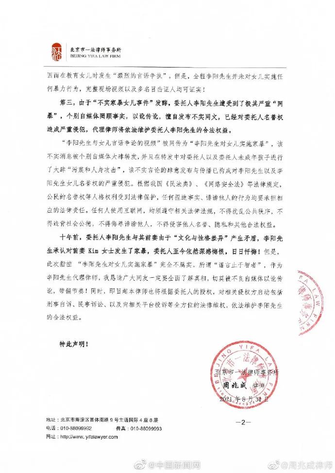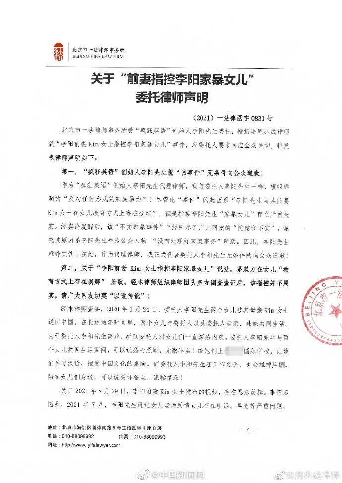 31日,@周兆成律师 发文称,受“疯狂英语”创始人李阳先生委托,就“李阳前妻Kim女士指控李阳家暴女儿”事件发表律师声明:第一,“疯狂英语”创始人李阳先生就“该事件”无条件向公众道歉。第二,关于“李阳前妻Kim女士指控李阳家暴女儿”说法,系双方在女儿“教育方式上存在误解”所致,经本律师组织律师团队多方调查查证后,该指控并不属实,请广大网友切莫“以讹传讹”。即日起,将根据委托人的授权,对相关侵权方启动包括刑事自诉、民事诉讼、以及向相关平台投诉等全方位的法律维权,依法维护李阳先生的合法权益。随后,李阳转发了这一声明。