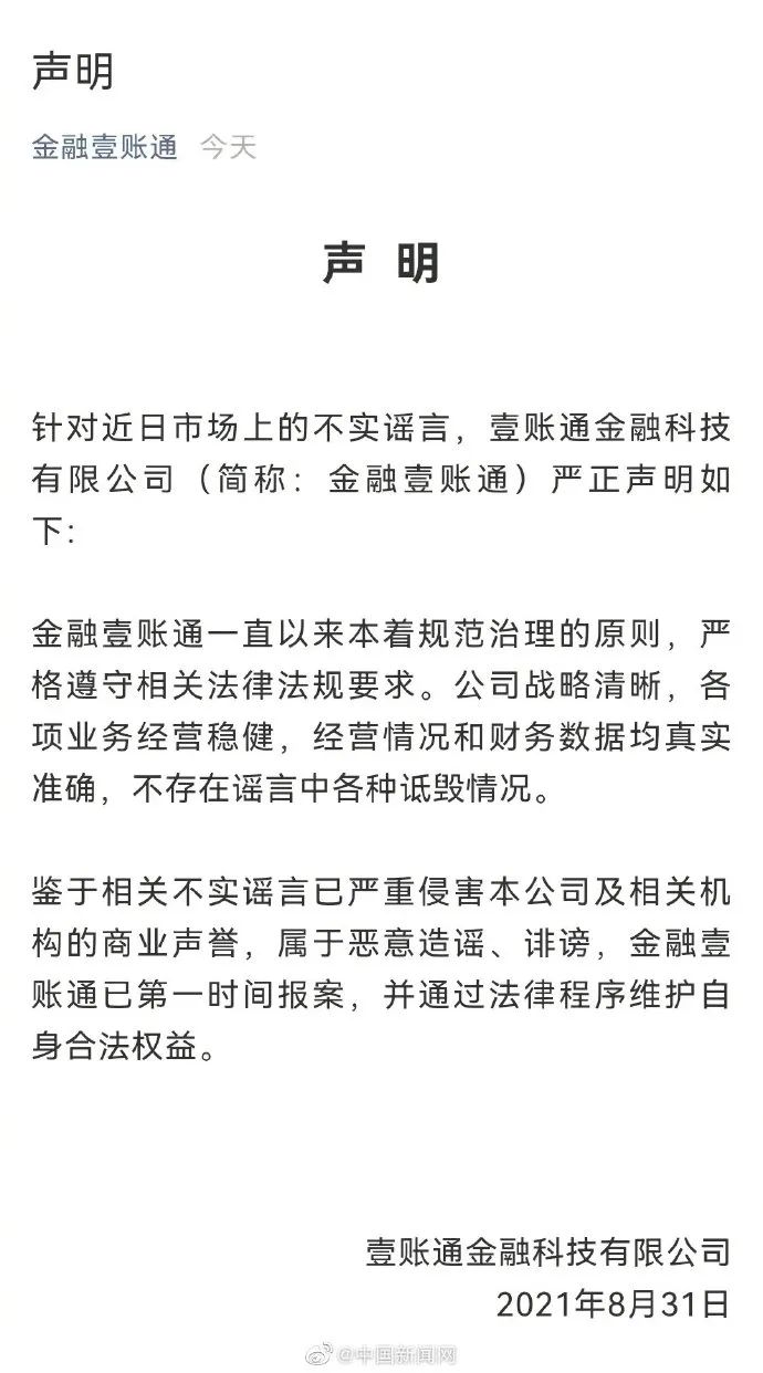 针对近日网络上有举报信称中国平安旗下的金融壹账通存在财务欺诈、商业贿赂、隐瞒重大信息披露等行为,壹账通金融科技有限公司31日发布声明称,公司经营情况和财务数据均真实准确,不存在谣言中各种诋毁情况。鉴于相关不实谣言已严重侵害本公司及相关机构的商业声誉,属于恶意造谣、诽谤,金融壹账通已第一时间报案,并通过法律程序维护自身合法权益。