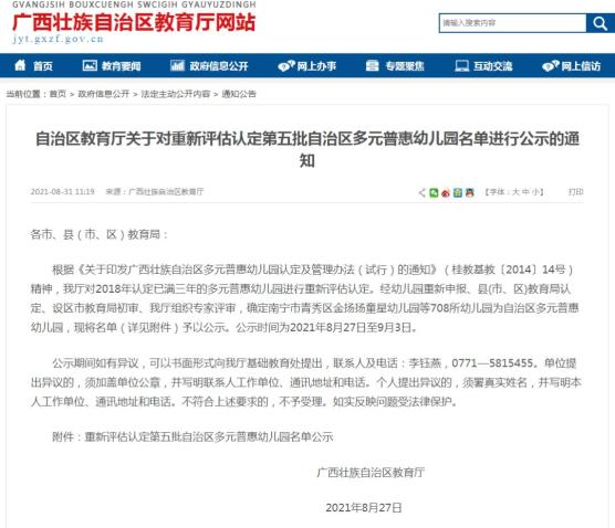8月31日,广西壮族自治区教育厅发布2批公示名单,分别为重新评估认定第五批自治区多元普惠幼儿园名单,以及2021年新认定的自治区多元普惠幼儿园名单。据悉,多元普惠幼儿园是指符合各地幼儿园布局规划,由社会组织、国有企业、优质公办园、个人等多方力量按国家和自治区办园标准举办的,接受政府补助,实行政府指导价,提供公益性、普惠性服务的非营利学前教育机构。