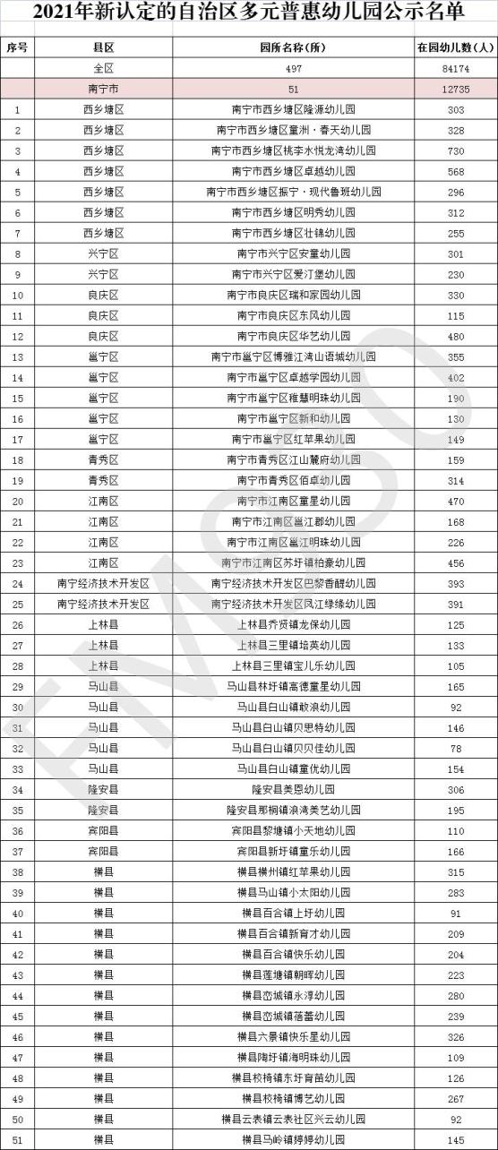 2021年新认定的497所自治区多元普惠幼儿园名单中,