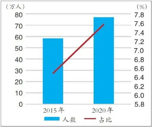 乡村学校美育师资队伍数量不足,专业化程度欠缺。在国家美育政策的推动下,全国美育教师人数增速明显。教育部发布数据显示,全国义务教育阶段美育教师人数由2015年的59.9万人增长为2020年的77.8万人,五年来增加17.9万人,平均增速为7.8%。美育教师占专任教师总数的比例由2015年的6.5%提高到2020年的7.6%,提升了1.1个百分点。