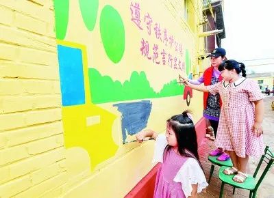在河北文安县文安镇东关村,小学生和志愿者为墙绘作品填涂颜色。新华社发