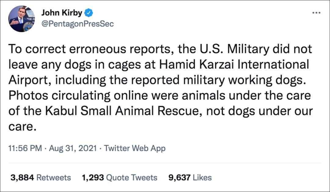 2,被遗弃的是美军军犬吗?8月31日,美国国防部新闻秘书、发言人约翰·柯比(John Kirby)在推特上称:“纠正错误报道,美国军方没有把任何犬只遗弃在哈米德·卡尔扎伊国际机场(即喀布尔机场——注)的笼子里,包括有关报道所言的军用工作犬(military working dogs)。网上流传的照片是由喀布尔小动物救援组织(Kabul Small Animal Rescue)照顾的动物,不是由我们照顾的狗。”