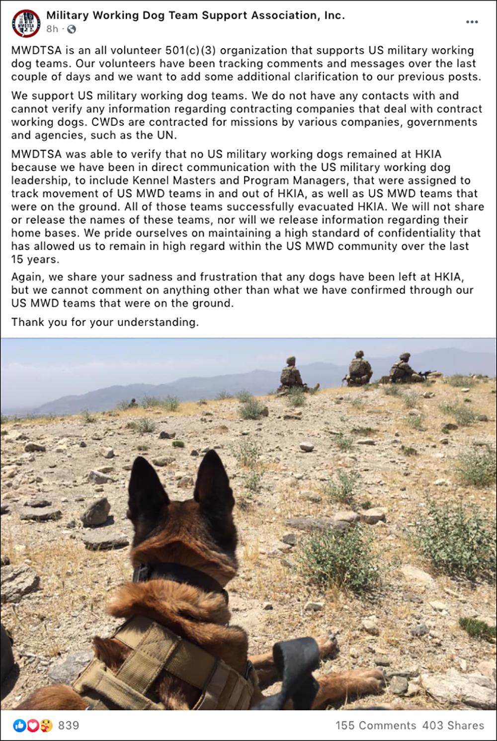 美国军用工作犬团队支持协会是一家非营利组织,成立于2006年,自称为美国陆军、空军、海军、海军陆战队、海岸警卫队的军用工作犬和驯犬师提供支持。9月2日,美国军用工作犬团队支持协会再次发布Facebook贴文称:“MWDTSA能够证实没有美军工作犬留在哈米德·卡尔扎伊国际机场,因为我们一直在与美军工作犬团队的领导层保持直接沟通,包括犬舍主人和项目经理,他们被指派跟踪美军工作犬团队进出哈米德·卡尔扎伊国际机场的动向,以及在当地的美军工作犬团队。所有这些团队都成功撤离了哈米德·卡尔扎伊国际机场。”