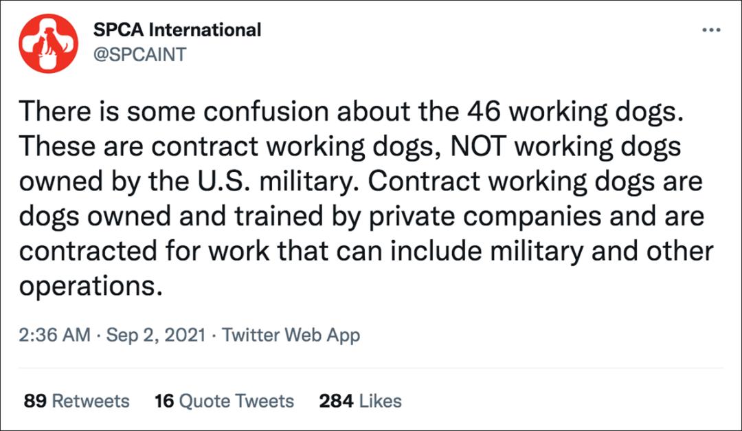 该组织进一步在9月2日表示:“关于46只工作犬的消息有一些混淆。这些是合同工作犬,而不是美国军队拥有的工作犬。合同工犬是由私人公司拥有和训练的狗,它们被承包的工作可能包括军事和其他行动。”