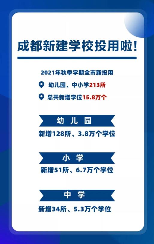 2021年秋季学期成都市新投用幼儿园、中小学213所,其中幼儿园、小学、中学分别128所、51所、34所,分别新增学位3.8万个、6.7万个、5.3万个,总共新增学位15.8万个,实际使用学位6.4万个。