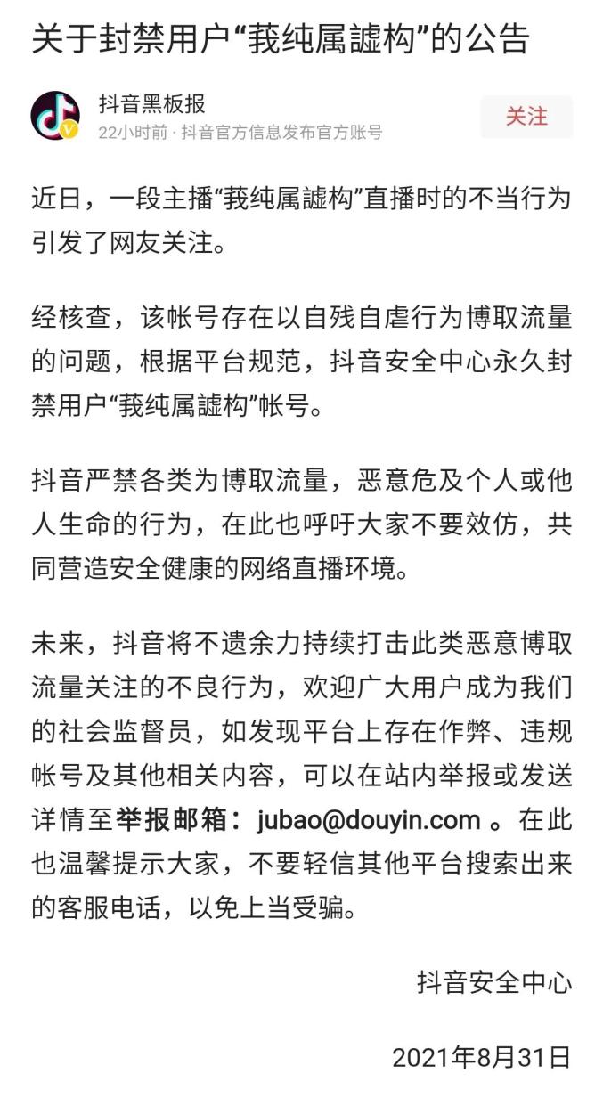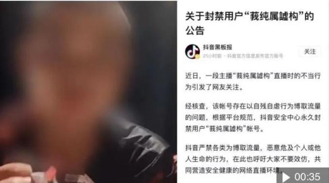 公告显示,经核查,该账号存在以自残自虐行为博取流量的问题,根据平台规范,抖音安全中心永久封禁用户“莪纯属譃构”帐号。抖音强调,严禁各类为博取流量,恶意危及个人或他人生命的行为,在此也呼吁大家不要效仿,共同营造安全健康的网络直播环境。