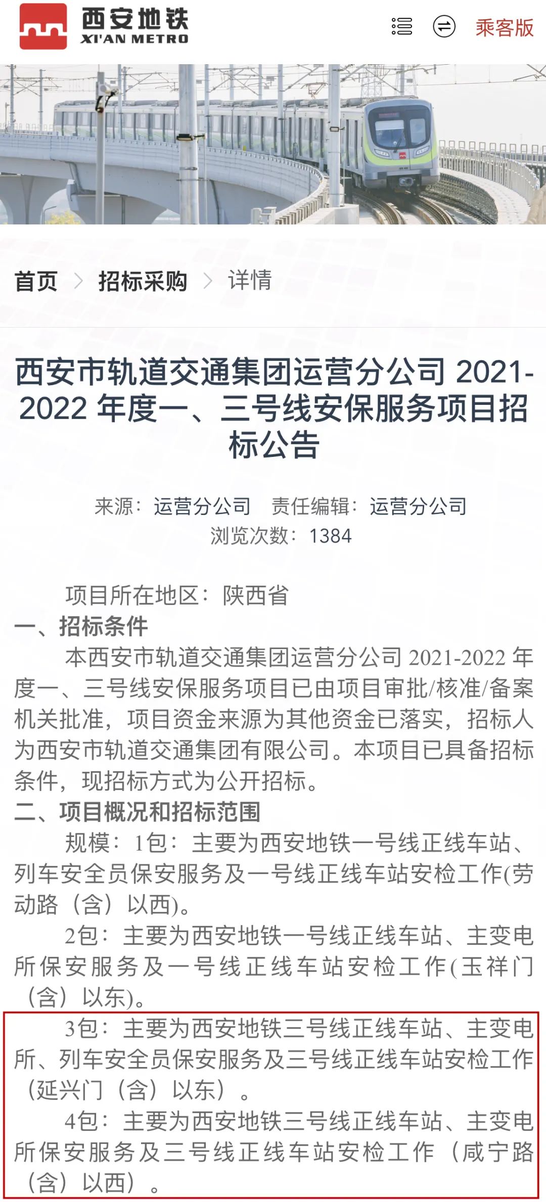 据《西安市轨道交通集团运营分公司2021-2022年度一、三号线安保服务项目招标公告》显示,2020年12月,西安市轨道交通集团有限公司曾将地铁1号线、3号线分成4个标段,分别对外进行招标。其中3号线的安保项目所占标段被分为“第3包”和“第4包”。