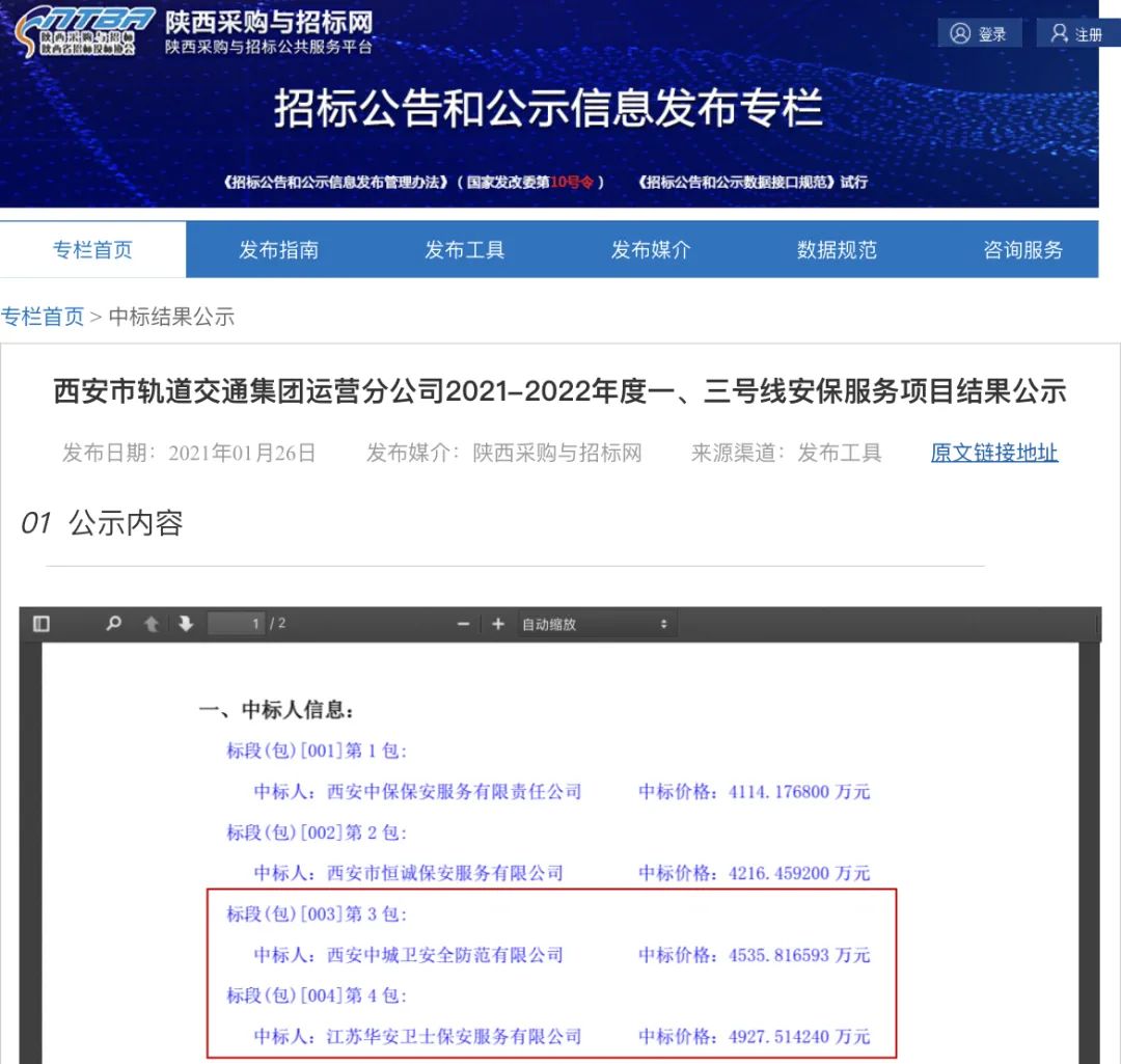 结合“陕西采购与招标网”在今年1月26日公示的招标结果来看,最终西安中城卫中标“第3包”,负责3号线正线车站、主变电所、列车安全员保安服务及3号线正线车站安检工作(延兴门(含)以东);