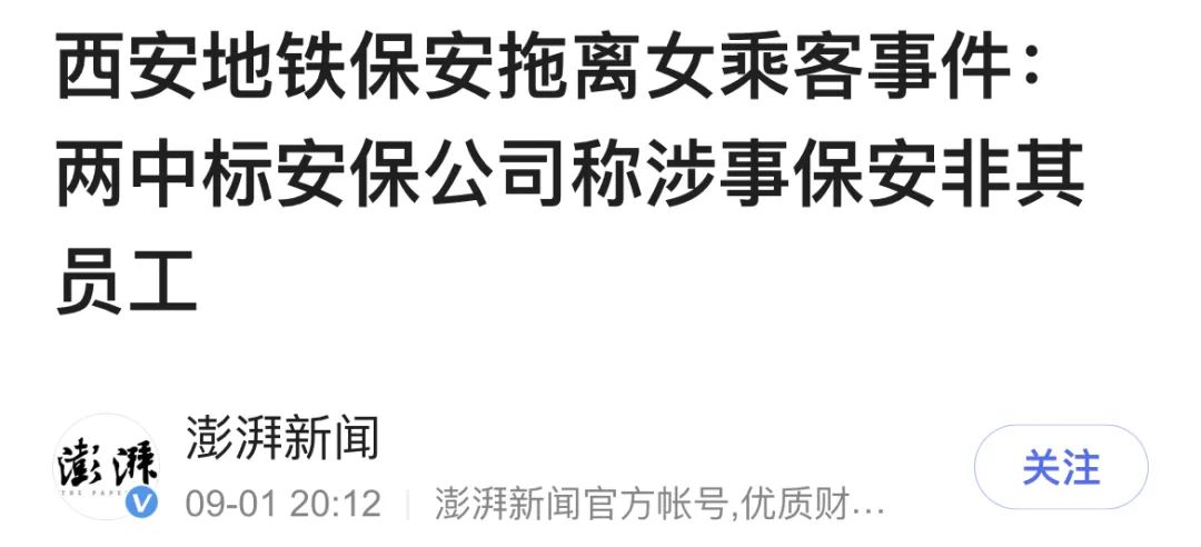 不过直到现在,涉事保安究竟就职于哪家安保公司、是否已被停职皆是未知状态。观察者网查询发现,西安地铁各运营线路的安全员保安服务均为外包,涉事地铁西安地铁3号线也是如此。