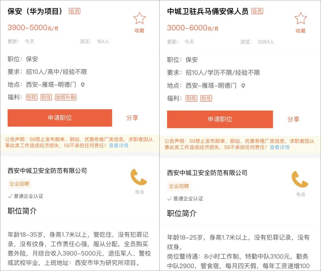 不过观察者网查询了两家公司的招聘启事发现,西安中城卫近期没有对地铁安保员进行招聘,参考其在其他领域的保安岗位招聘要求,该公司对应聘人员不限经验,不要求持有《保安员证》,也未写明是否会在录用后组织统一培训取证。