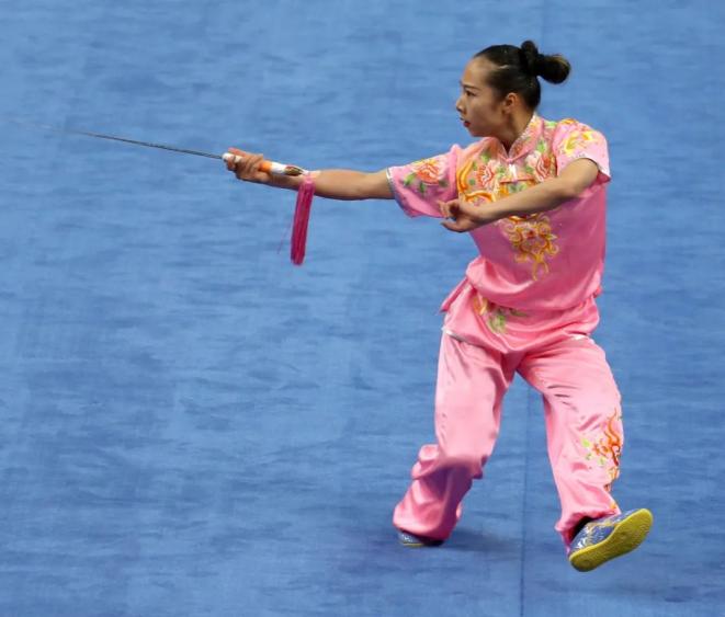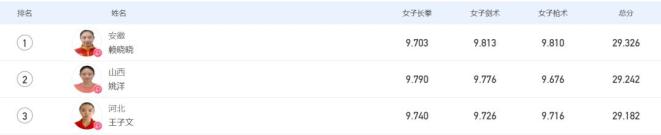 进入剑术项目,率先出场的河北、山西等省强手相继取得高分。赖晓晓顶住压力,直刺、平斩,一柄银剑虎虎生风;腾空、跳跃,双脚落地稳如泰山,豪取9.813分登上第一、完成反转,加上长拳得分,名次上升到第二。