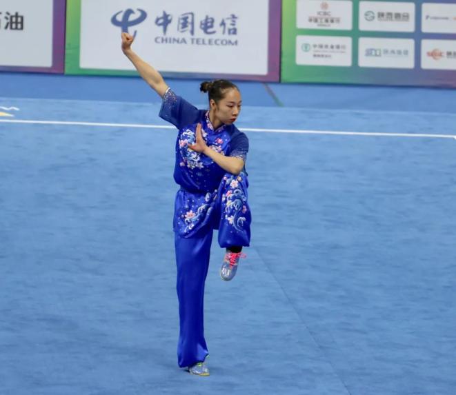 在长拳项目中,赖晓晓一袭蓝衣登场,闪转腾挪,动静疾徐,刚柔相济,灵活多变,由于在落地中略有晃动而稍稍减分,以9.703分名列第四。