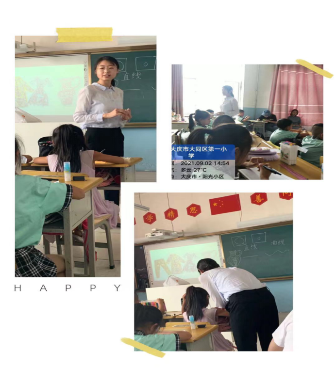 在美术课上,巩爽老师执教的《会变的线条》一课,课上教师鼓励学生从不同角度去思考有关线条的知识,提出自己的问题,并引导学生认识不同的线条,通过ppt展示、播放相关乐曲,让学生们清晰的了解到直线、曲线、折线,三种不同的线条。