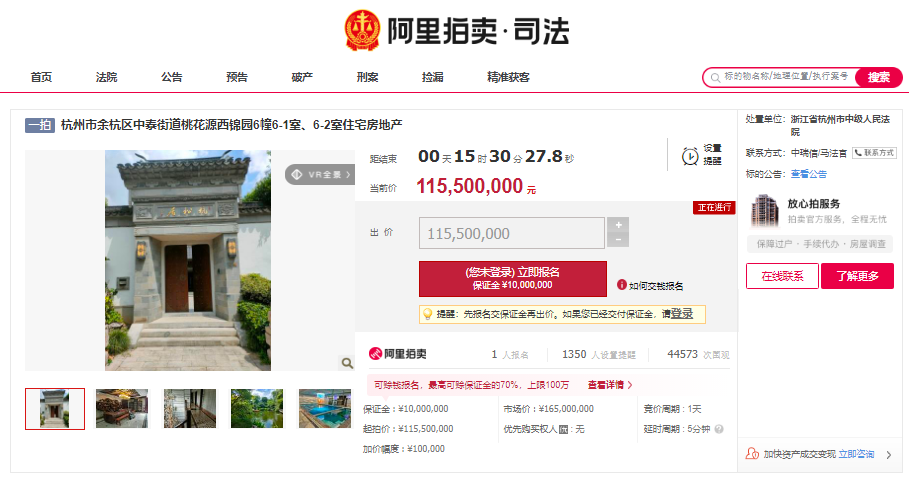 9月6日10时,一套位于杭州市余杭区中泰街道桃花源西锦园6幢6-1室、6-2室住宅(下称“桃花源西锦园别墅”)在阿里法拍平台开拍,起拍价1.155亿元,相当于市场价1.65亿元打了7折。