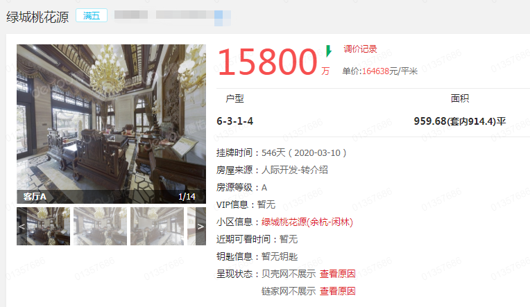 目前,桃花源西锦园别墅依然在房屋中介平台挂牌,但因超出限价无法在前端显示。“限制价格不能超过每平方米12万,以1.58亿元的挂牌价来算,它的挂牌单价达到每平方米16万左右。”刘勇说道。