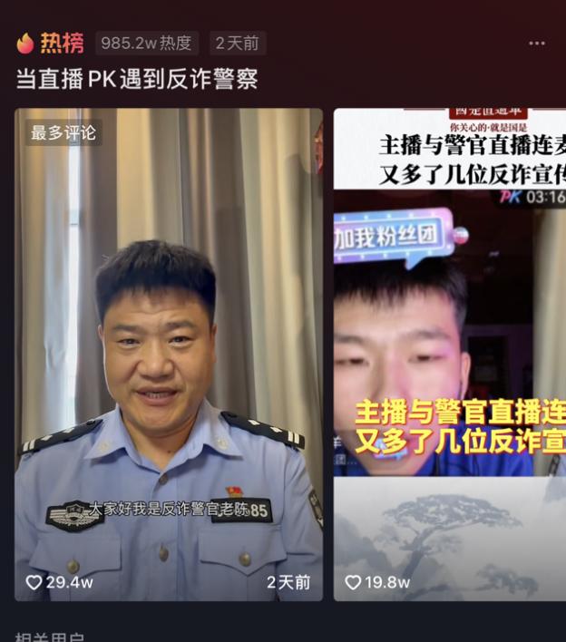 数据显示,在抖音上“反诈警官老陈”两场直播观看人次累计超过3800万,获赞超过1亿次。“当直播PK遇到反诈警察”话题登上抖音热榜第一。在快手上,陈国平的直播观看人数超过2300万,参与连麦的主播直播间总观看人数破亿,总互动量达8000万+。