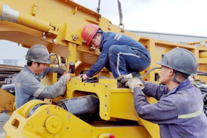 随着产能升级和技术改造,曾经靠“手挖肩挑”的小煤矿也有了大型综合机械化掘进机。图为技术人员正在调试鑫鑫煤矿的综掘机。