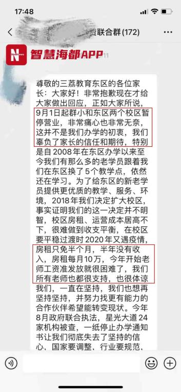家长盼退费 机构负责人写下欠条海都君了解到,目前家长们自发组建了维权群,有将近两百人入群。此外,有部分被拖欠工资的老师也在群中。在维权群里,海都君见到了家长转发的该校培训机构负责人蔡校长的一段文字,内容中告知家长9月1日起校区暂停营业,财务将算出截止8月31日每位学生剩余课时,并寻找有能力的机构接收学生,并表示“没有跑路,正在积极的寻找解决的办法,并尽快筹钱。”该消息发出的时间为8月31日。之后,蔡校长又陆续在其它群发布消息,称将于周日(9月5日)下午在五一北路校点为家长办理退费手续。