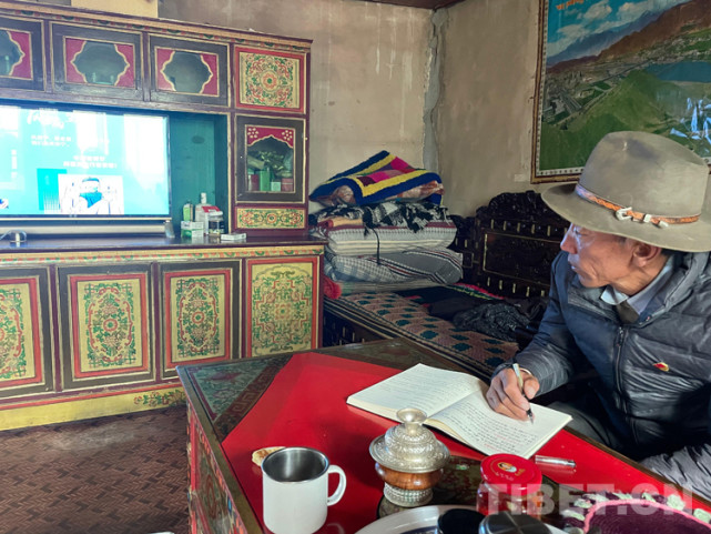 图为索朗顿珠收听收看时政新闻