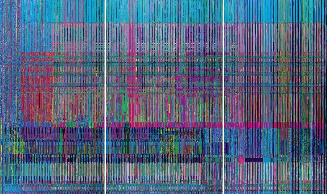 巨幅三联画《真实的维度No.18》就是一个很好的例子,该作耗时一年半完成,以数码图像为蓝本,然后由工人涂抹到画布的对应位置,形成类似“色域”绘画的视觉体验。但在炫目的图像外,刘韡对“真实”的探讨,似乎又非常含混,甚至就像是在用“真实的维度”来质疑“真实”本身。但争议并不影响刘韡在市场中的表现,或者说他的支持者和反对者都非常坚定。