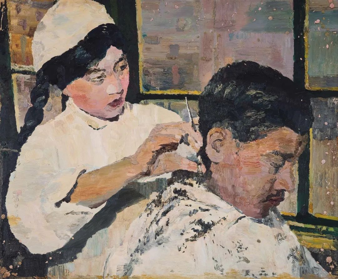 《我们知道我们的忧郁》很能说明仇晓飞的早期风格,画中一位女理发师正在为男性顾客理发,色调泛黄如老照片一般,粗犷的笔法配合理发师鲜明的发型和服装,有一种扑面而来的年代感。作品名《我们知道我们的忧郁》,又似乎暗示了某些隐含的两性较量意味,同时还带着些对特定历史时代的批判,但都十分隐晦。
