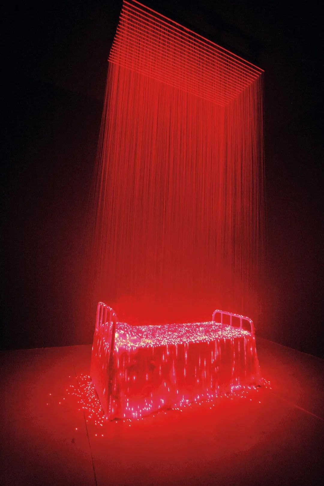 早逝的青年艺术家李晖常借由绚丽而具有科技感的素材探讨艺术中的严肃主题。在《轮回》中,艺术家运用了激光、烟雾、医用纱布等在装置艺术中非常规的材料,组合营造出一种变化、迷幻、神秘,甚至宗教式的视觉效果。人的出生和死亡大都在床上,在激光的照射下,这种生死之间的轮回宿命变得更加意味深长。TOP33