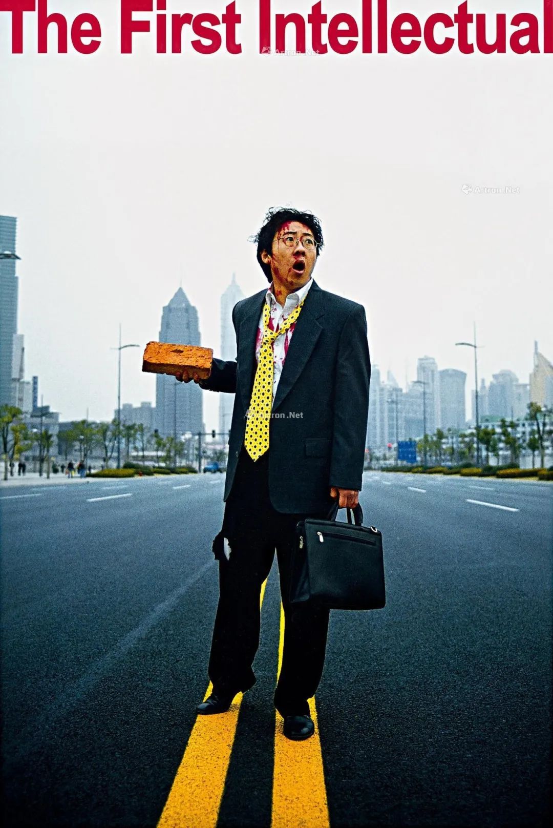 杨福东是中国最具知识分子气质的艺术家,而他这件2000年的摄影作品也把关注点放置在都市知识分子身上:一位穿着西装革履但却变得衣衫不整,裤子右膝处显出破洞,手提公文包的男子,站在黄色交通警示线上,满脸血迹,右手持砖,做出死磕状,他希望反击,但却没有目标。再加上这一行赫然其上的英文字母,使这件作品释放出莫名的尴尬与围困,这难道就是知识分子的真实情态?