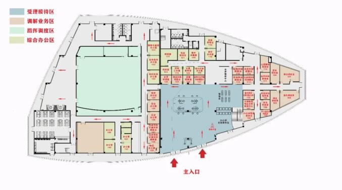 中心建筑共两层,总面积约5243平方米,分别为一楼:受理接待区、调解业务区、综合办公区、指挥调度区;二楼:诉讼服务区、综合办公区、调解业务区。