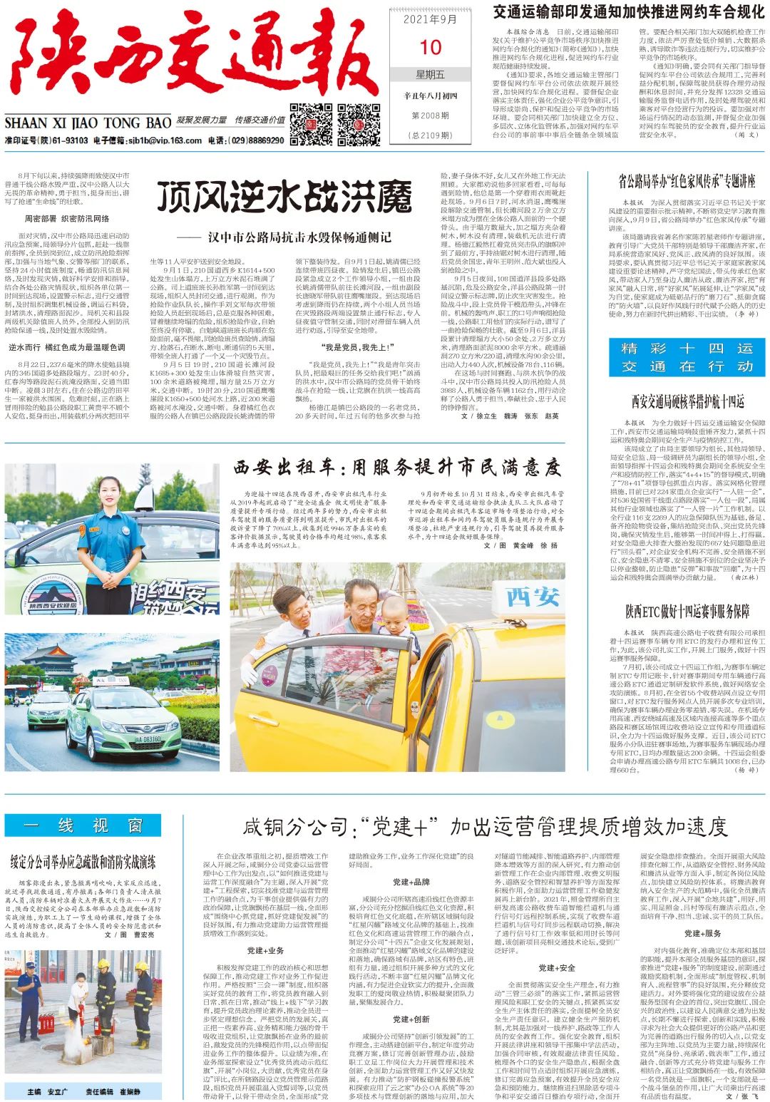 ▲ 西安出租车:用服务提升市民满意度。为迎接十四运在陕西召开,西安市出租汽车行业从2019年起就启动了“迎全运盛会 做文明使者”服务质量提升专项行动。经过两年多的努力,西安市出租车驾驶员的服务质量得到明显提升,市民对出租车的投诉量下降了70%以上,收集到近9946万条真实的乘客评价数据显示,驾驶员的合格率均超过98%,乘客乘车满意率达到95%以上。9月初开始至10月31日结束,西安市出租汽车管理处和西安市交通运输综合执法支队三大队启动了十四运会期间出租汽车客运市场专项整治行动,对全市巡游出租车和网约车驾驶员服务违规行为开展专项整治,引导驾驶员再提升服务水平,为十四运会做好服务保障。(黄金峰 徐 扬)▶ 西安市交通运输局全力做好十四运交通运输安全保障工作。成立了由局主要领导为组长,其他局领导、局安全总监、局一级调研员为副组长的领导小组,全面领导指挥十四运会和残特奥会期间全系统安全生产和疫情防控工作,落实“4+4+15”的督导模式,明确了“78+41”项督导包抓重点内容。落实网格化管理措施,目前已对224家重点企业实行“一人驻一企”,对536处国省干线重点路段落实“一人包一段”,局属其他行业领域也落实了“一人管一片”工作机制。对安全隐患大排查大整治发现的657处问题隐患进行“回头看”,为十四运会和残特奥会圆满举办贡献力量。(曲江林)