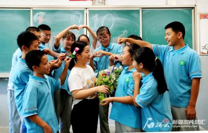 在第三十七个教师节到来之际,9月8日,新疆生产建设兵团第五师90团学校七年级(2)班学生为老师送上鲜花,表达对老师的节日祝福。秦桂连摄