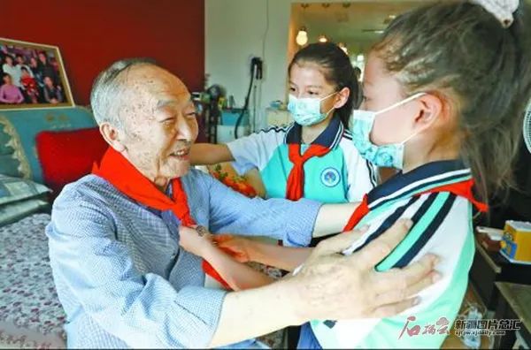 9月7日,乌鲁木齐市第八十七中学二年级(4)班学生乃菲赛·艾山(右一)为77岁的退休教师高玉金佩戴红领巾,并送上教师节祝福。当日,乌鲁木齐市水磨沟区教育局驻宏瑞社区“访惠聚”工作队联合乌鲁木齐市第八十七中学,为社区部分退休教师送上节日祝福。石榴云/新疆日报记者秦鹏摄