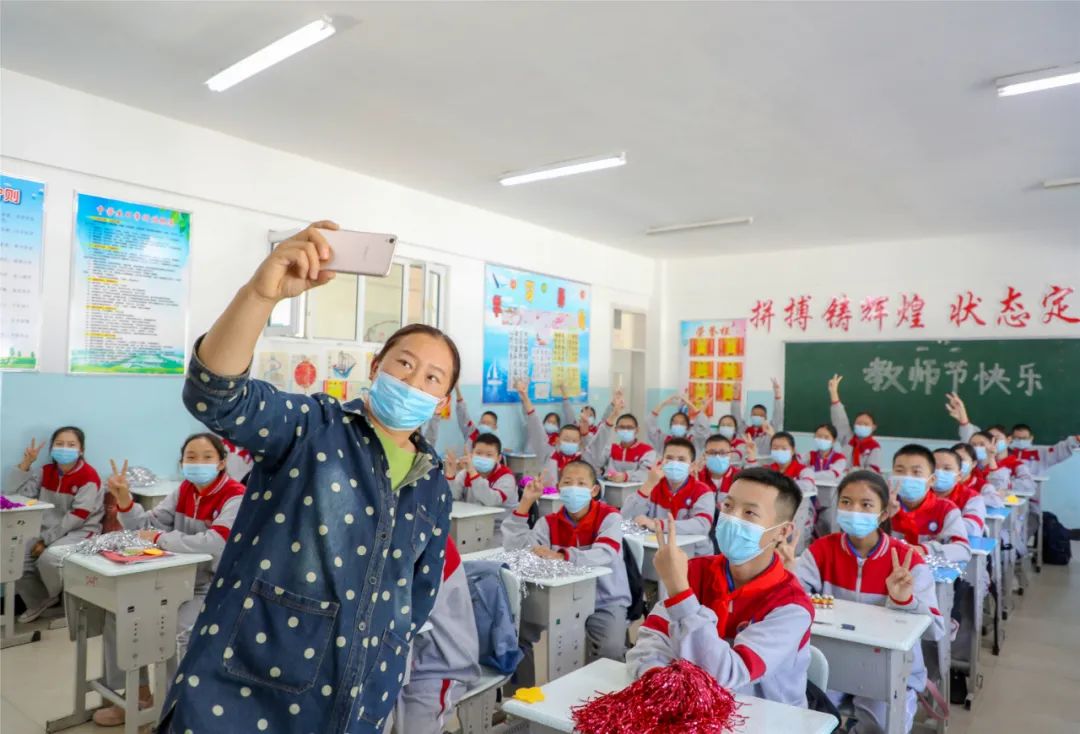 9月9日,精河县初级中学初二(8)班老师和学生一起合影。当日,该校开展“铭记师恩,感谢师恩”主题教师节活动,学生们通过参与“我和老师合个影”“我为老师唱首歌”等,为老师送上节日祝福。赛永杰摄