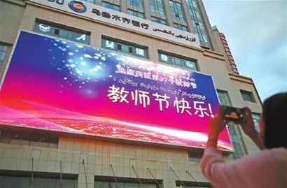 9月9日20时11分,西大桥一处楼体大屏显示“教师节快乐”等字样。来源:乌鲁木齐晚报