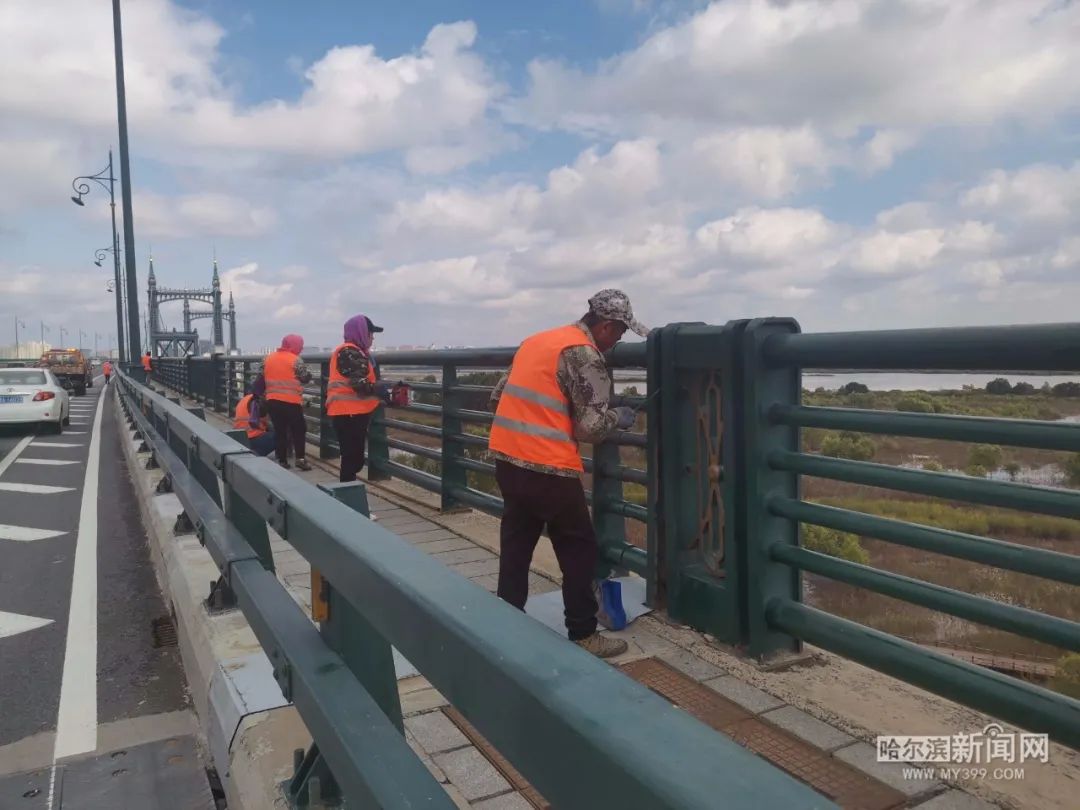 阳明滩大桥是通往哈尔滨新区的一条重要通道。日前,市城管局道桥部门对阳明滩大桥栏杆脱漆部分进行了油饰作业,每日出动油饰作业人员12人,一台工程车,计划10天将阳明滩大桥栏杆脱漆部分油饰完成。