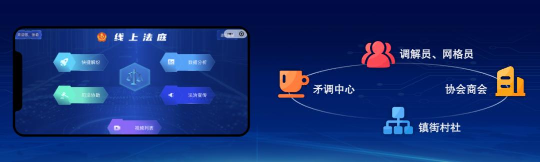 “线上法庭”坚持以人民法庭为支点和触角,依托移动微法院技术优势,开发并系统集成相关司法服务功能,设置快捷解纷、司法协助、法治宣传、数据分析四大功能模块,连接矛调中心、镇街村社、协会商会及调解员、网格员等组织和个人,通过法庭诉源治理各节点的在线办理、人民法庭与调解力量的线上双向协同,使矛盾纠纷分级分层过滤的多元化解体系,既有物理空间上的无缝衔接,又呈现线上线下深度融合、高效协同、整体智治的生动局面。司法码实现“三合四通”