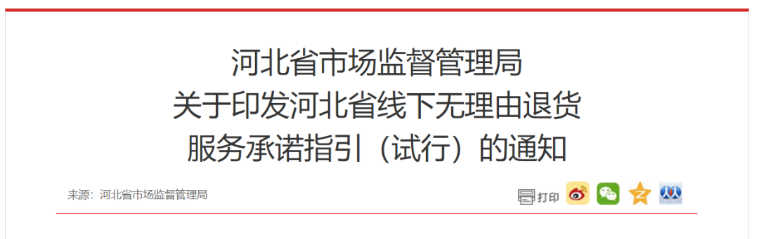 9月7日,河北省市场监管局印发《河北省线下无理由退货服务承诺指引(试行)》,按照“鼓励倡导,自愿承诺,承诺即受约束”的原则,在全省范围内倡导推行线下无理由退货服务承诺活动。