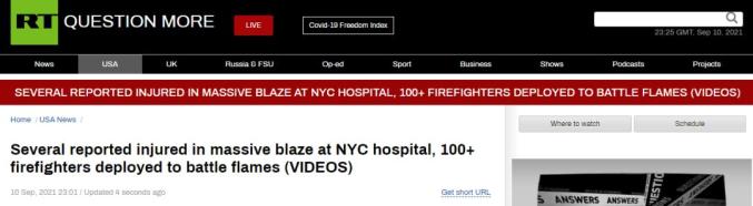 RT报道截图美国全国广播公司纽约频道称,第一批消防人员已于当地时间10日下午17时左右前往火灾现场。另据RT报道,目前已有超过100名消防人员紧急前往火灾现场进行灭火。
