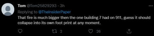 有网友认为这场大火似乎比“9·11”那次还要严重:“这大火比‘9·11’事件7号楼着火那次大多了,我猜它可能任何时候都可能被烧倒。”↓