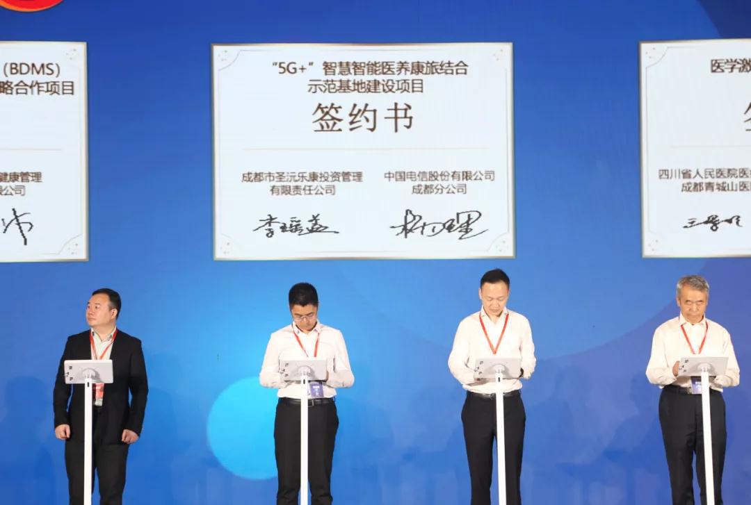 在本次大健康博览会上,中国·青城国际颐养中心与中国电信股份有限公司成都分公司的签约也同样引人注目,斥资千万,双方将合力打造“5G+”智慧智能医养康旅结合示范基地建设项目。