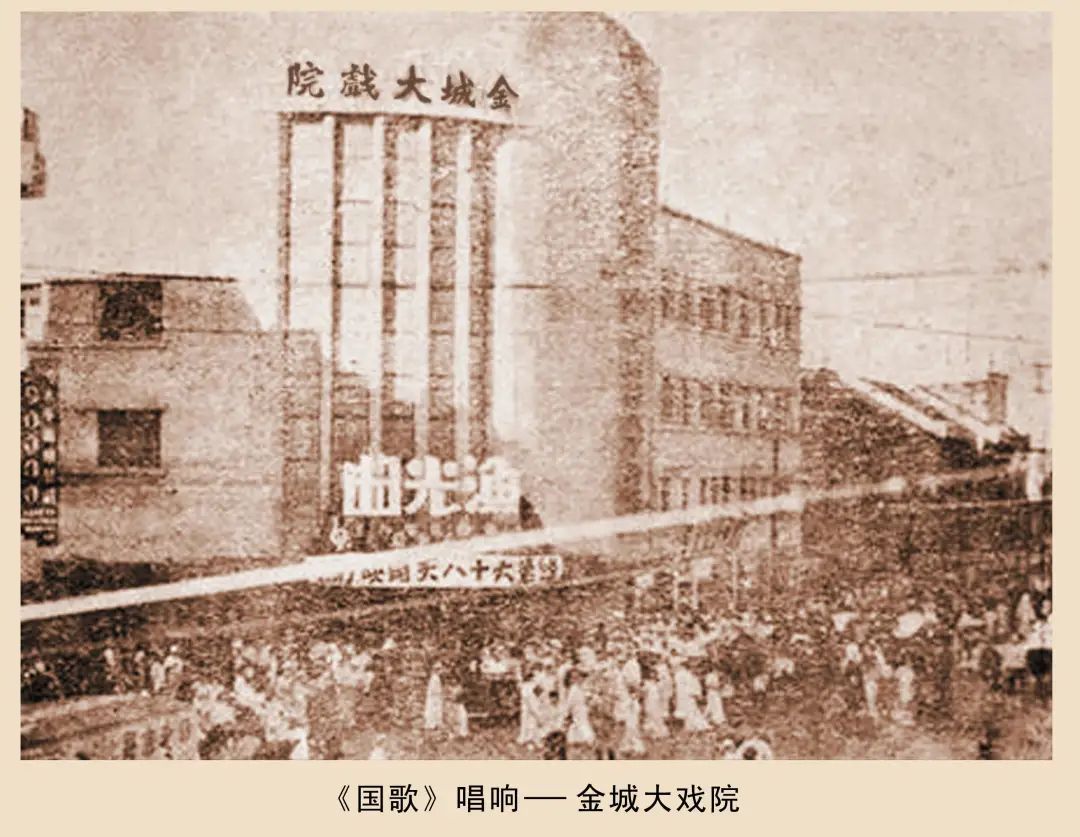 金城大戏院1938年春,在法国巴黎召开的反法西斯侵略运动大会上,任光指挥巴黎华侨合唱队,让《义勇军进行曲》第一次奏响于世界舞台。1940年,美国著名的男低音歌唱家、社会活动家保罗·罗伯逊,用汉语演唱《义勇军进行曲》,并将歌曲灌制在个人唱片集《起来》中,在欧美反法西斯人士中获得了极其良好的反响。