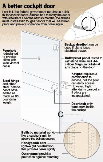 虽然“9.11”事件中,四架被劫持的飞机上发生了什么事无从知晓,但可以肯定的是袭击者们用各种手段突破了驾驶舱门,并控制了飞机,也因此在“9.11”事件之后所有的民航客机驾驶舱门都大幅强化,具有极强的防弹、防冲撞以及防破拆性能。而且可以让飞行员彻底锁死驾驶舱门,哪怕门外输入了正确的驾驶舱门开门密码,飞行员依然可以在足够长的时间内将开门指令否决掉,并切换成反锁状态确保外部无法打开。